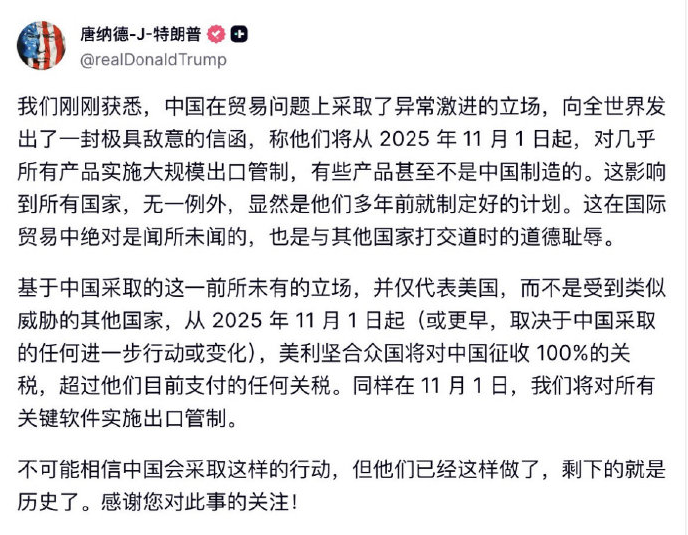 并且特朗普还称:“我们刚刚获悉,中国在贸易议题上态度极为强硬,并向全球发出一封极具对抗性的信函,声称拟自2025年11月1日起,对几乎所有中国制造产品甚至部分非中国产商品实施大规模出口管制。”