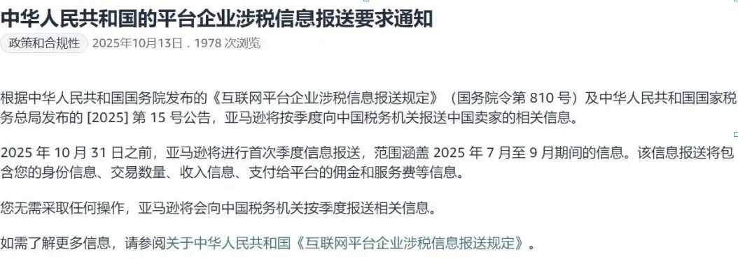 10月13日,亚马逊发布了一则《中华人民共和国的平台企业涉税信息报送要求通知》。