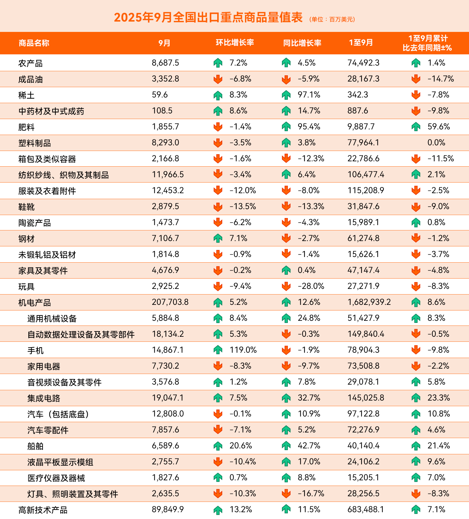 与去年相比,今年9月,高新技术产品、机电产品、劳动密集型产品同比增速分别回升至11.5%、12.6%、-4.1%。