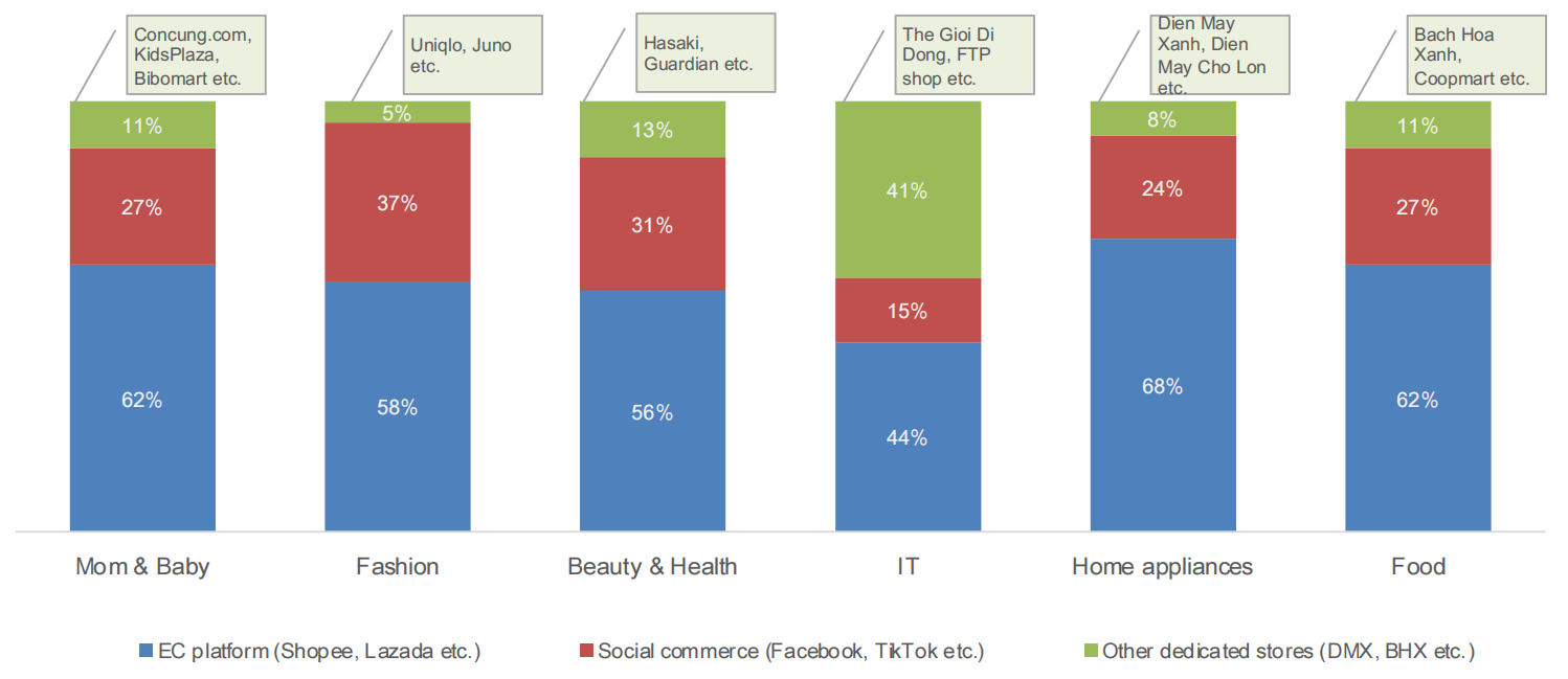数据显示,Shopee在各品类中均是最受欢迎的平台,而TikTok在美容和时尚品类中位居第二,在母婴、家电和食品品类中均位居第三,Lazada也是各品类中倾向于选择的前三大平台之一。值得注意的是,The Gioi Di Dong、Dien May Xanh等专卖店在IT品类中很受欢迎,分别位于第2和第5。