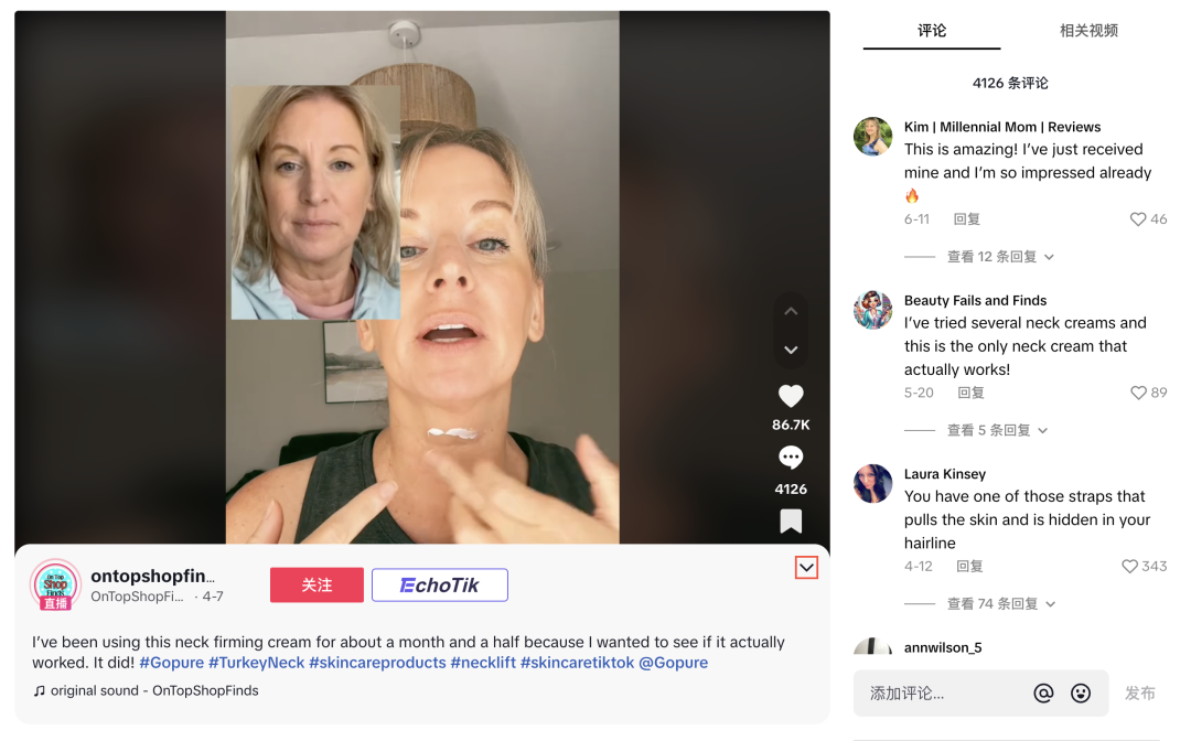 在TikTok上,网红通过使用产品的真实测评来为 Gopure的美颈霜带货。博主 @ontopshopfinds 在通过使用美颈霜的前后对比,来体现产品对颈部肌肤的提升和除皱的显着效果,并且教大家正确的按摩手法。在评论区可以看见大家对该产品的神奇效果的热烈探讨。22 秒的视频最终带来了超过 2000 万的播放,预估销量转化为 2.4 万件,GMV 达到 72.74 万美金。