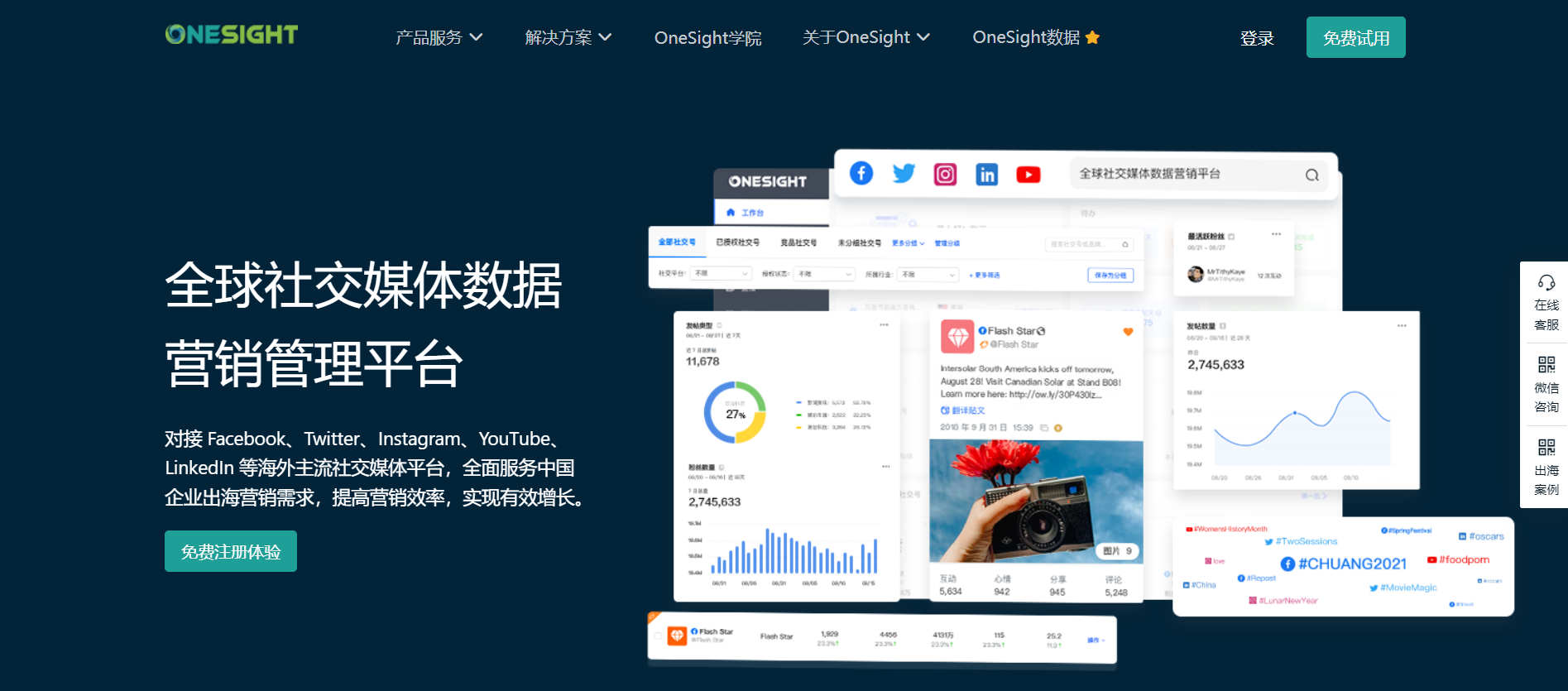 OneSight(一网互通)自成立以来,服务上千家企业级客户,赋能中国品牌出海,释放海量数据价值,带动中国出海品牌实现海外社交媒体营销的升级和跨越;以便捷的SaaS化一站式服务,成熟的全行业解决方案,带动中国出海品牌实现海外社交媒体营销的升级和跨越;