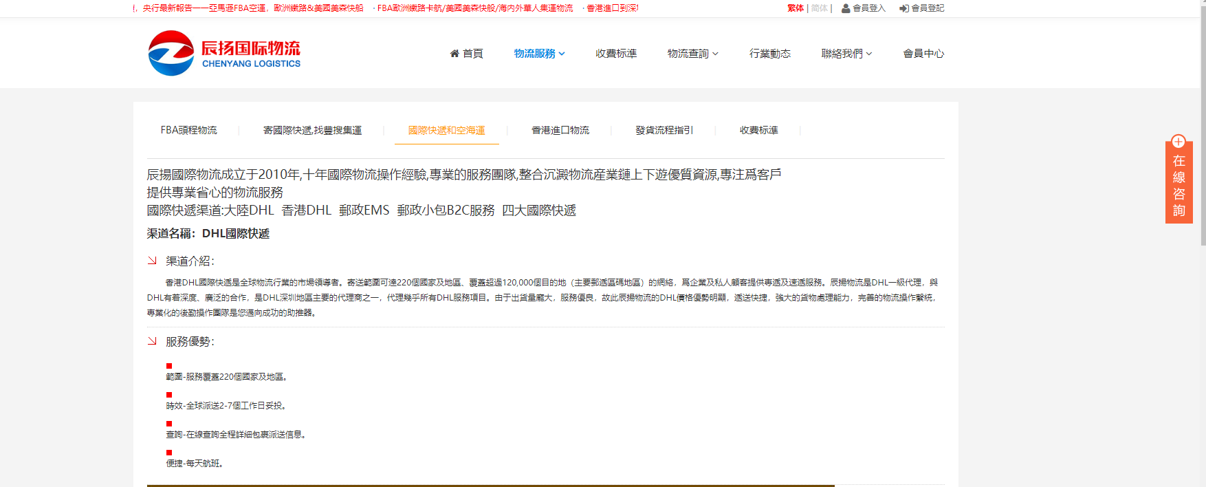 香港DHL国际快递是全球物流行业的市场领导者。寄送範围可达220个国家及地区、覆盖超过120,000个目的地(主要邮递区码地区)的网络,爲企业及私人顾客提供专递及速递服务。辰扬物流是DHL一级代理,与DHL有着深度、广泛的合作,是DHL深圳地区主要的代理商之一,代理几乎所有DHL服务项目。由于出货量庞大,服务优良,故此辰扬物流的DHL价格优势明显,递送快捷,强大的货物处理能力,完善的物流操作繫统,专业化的后勤操作团队是您迈向成功的助推器。