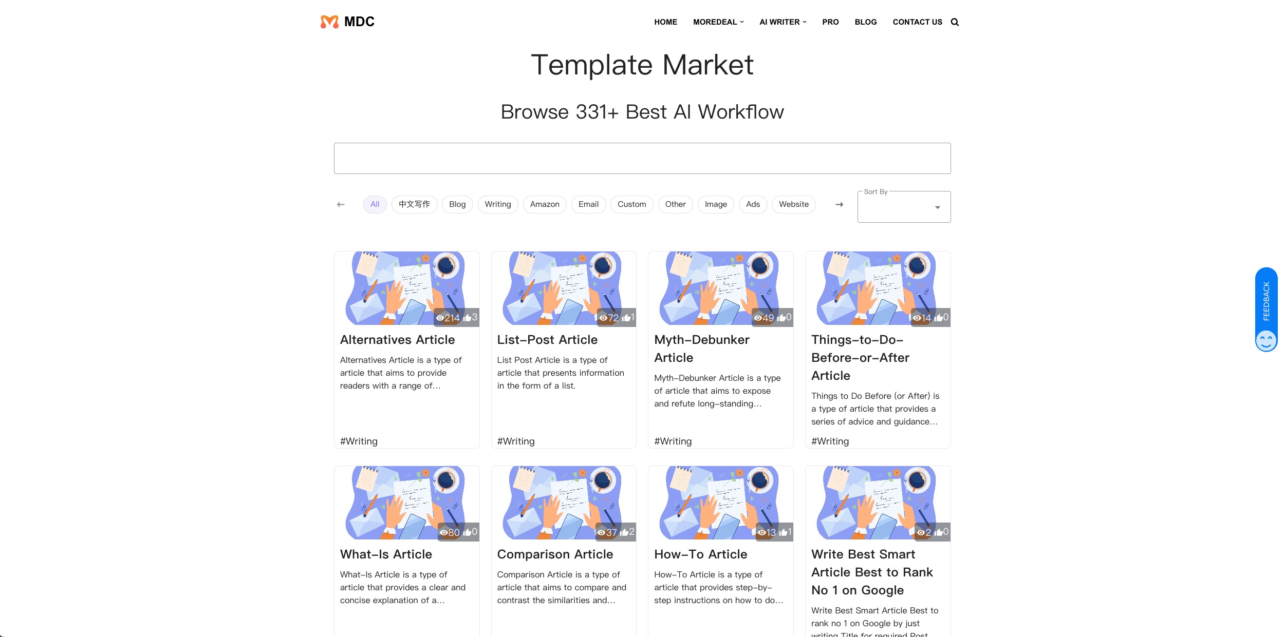 MDC AI助手涵盖亚马逊、独立站、社交媒体、内容营销、日常办公、广告创意、招聘等16个领域,提供330多个优质的预设流程模板,可以快速上手使用。
