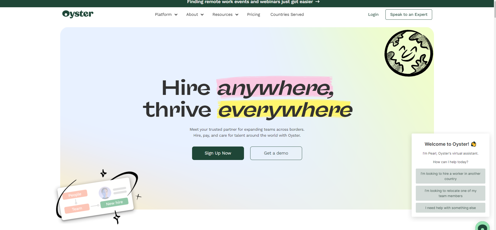 如果您正在快速扩展,则需要一个可以跟上步伐的解决方案。Oyster的全球就业平台可以迅速雇用和入职新的团队成员,并留在您的角落,以提供无缝的员工体验。