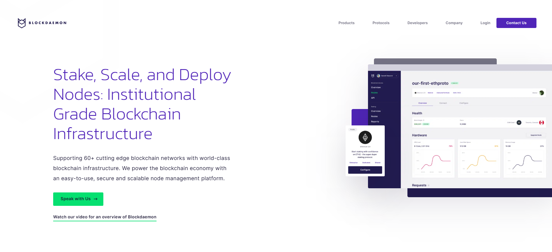 • Blockdaemon是领先的独立区块链节点基础设施,用于质押、扩展和部署具有机构级安全性和监控的节点。在云和裸机服务器上支持50+个尖端区块链网络,交易所、托管人、加密平台、金融机构和开发人员使用,将商业利益相关者连接到区块链。Blockdaemon通过简化节点部署过程并通过API、高可用性集群、节点的自动去中心化和自动修复来创建可扩展的企业区块链解决方案,从而为区块链经济提供动力。