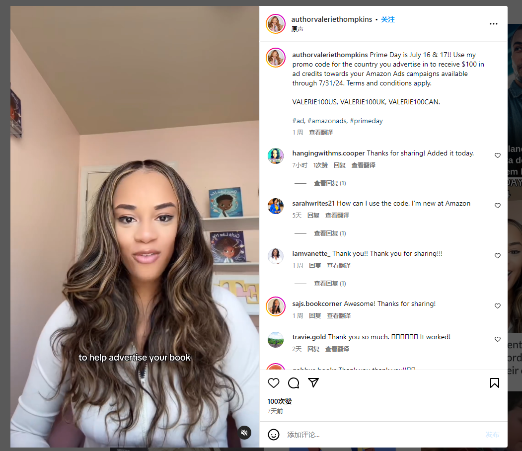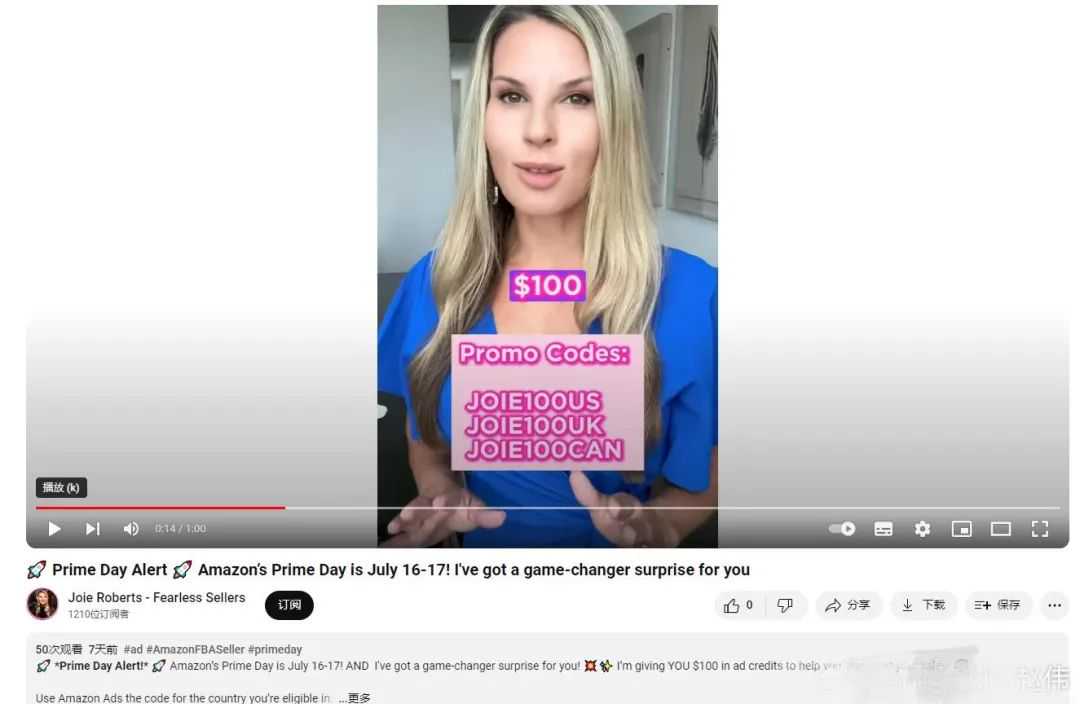一位网红在社交账号表示:“亚马逊给我提供了一个折扣码,用来分享给TikToK账号上的粉丝,领取并兑换即可获得100美元的广告费。”
