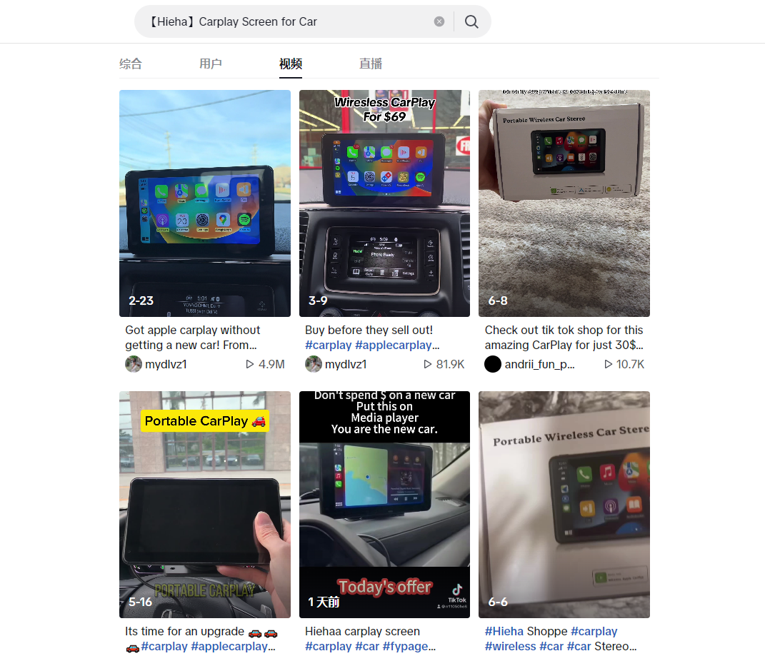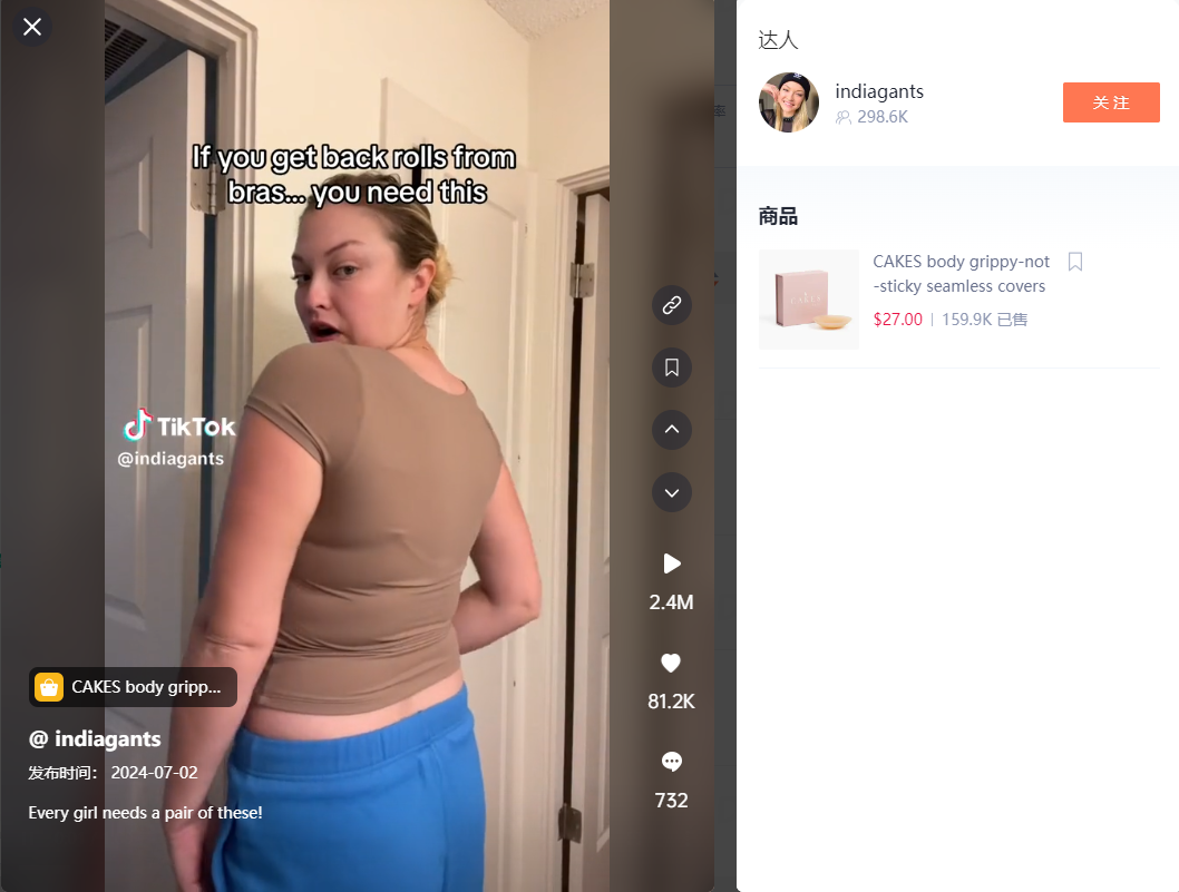 通过搜索商品关键词“cakes body grippy”可以看到相关产品的推广视频,由于这款产品卖点在于自身的体吸式天然粘合和具有极高适应性的舒适感,因此搜索到的全部带货视频均为实体测评演示。我们可以看到搜索下方有各种各样提醒和肤色的女生进行试用,并且产品完美地与她们合为一体,舒适且美丽。