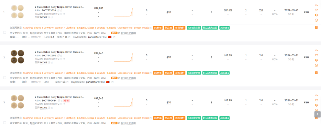 近期嘀嗒狗检测到一款十分畅销的乳贴,吸引了大量用户。商品上架之后,周销量达到了3.1万单,单品售价为27美刀。