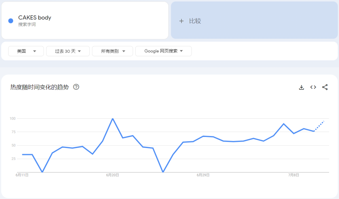 通过Google Trends我们可以看到在一定时间内,产品关键词在搜索引擎上的搜索热度和市场趋势。在输入产品关键词“CAKES body ”后,我们可以看到,相关搜索热度起伏不定,但热度一直保持,并且相关搜索从6.27日开始便持续上升日开始大幅上升。