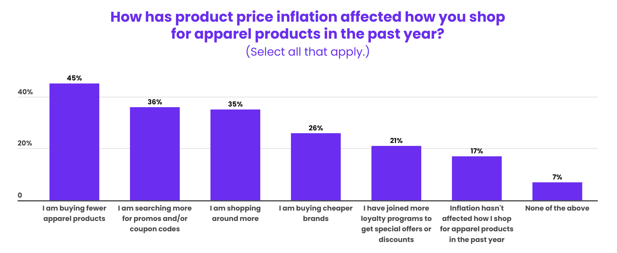 尽管大量消费者表示通货膨胀持续影响购买服装的方式,但在过去一年中,24%家庭收入20万美元或以上的消费者表示通货膨胀并未影响到服装购物,而在家庭收入低于5万美元的消费者中,只有15%表示服装购物未受通货膨胀影响。
