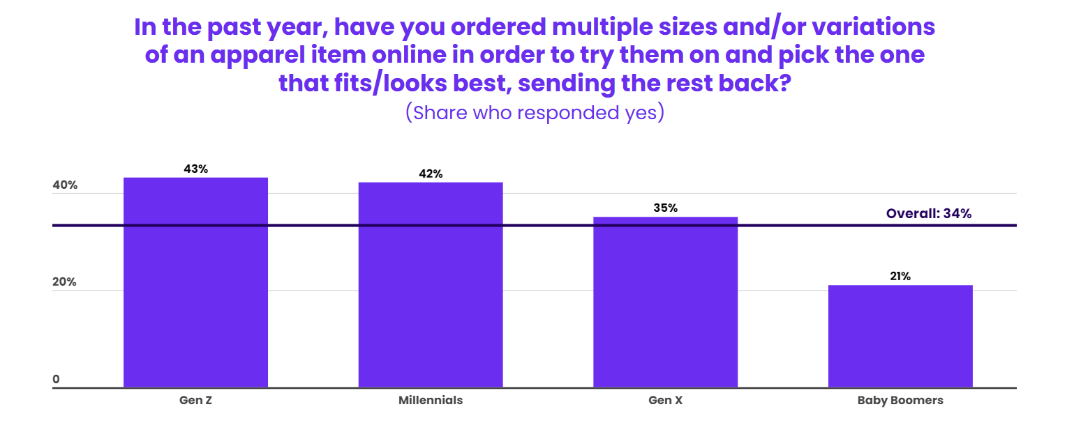 此外,34%的消费者表示,他们过去一年中会订购多种尺寸或款式的服装,以便挑选最合适的一款,然后将其余的寄回。这种做法被称为“包围式购买”,虽然也适用于退货政策,但对品牌和零售商造成了一定的成本负担。