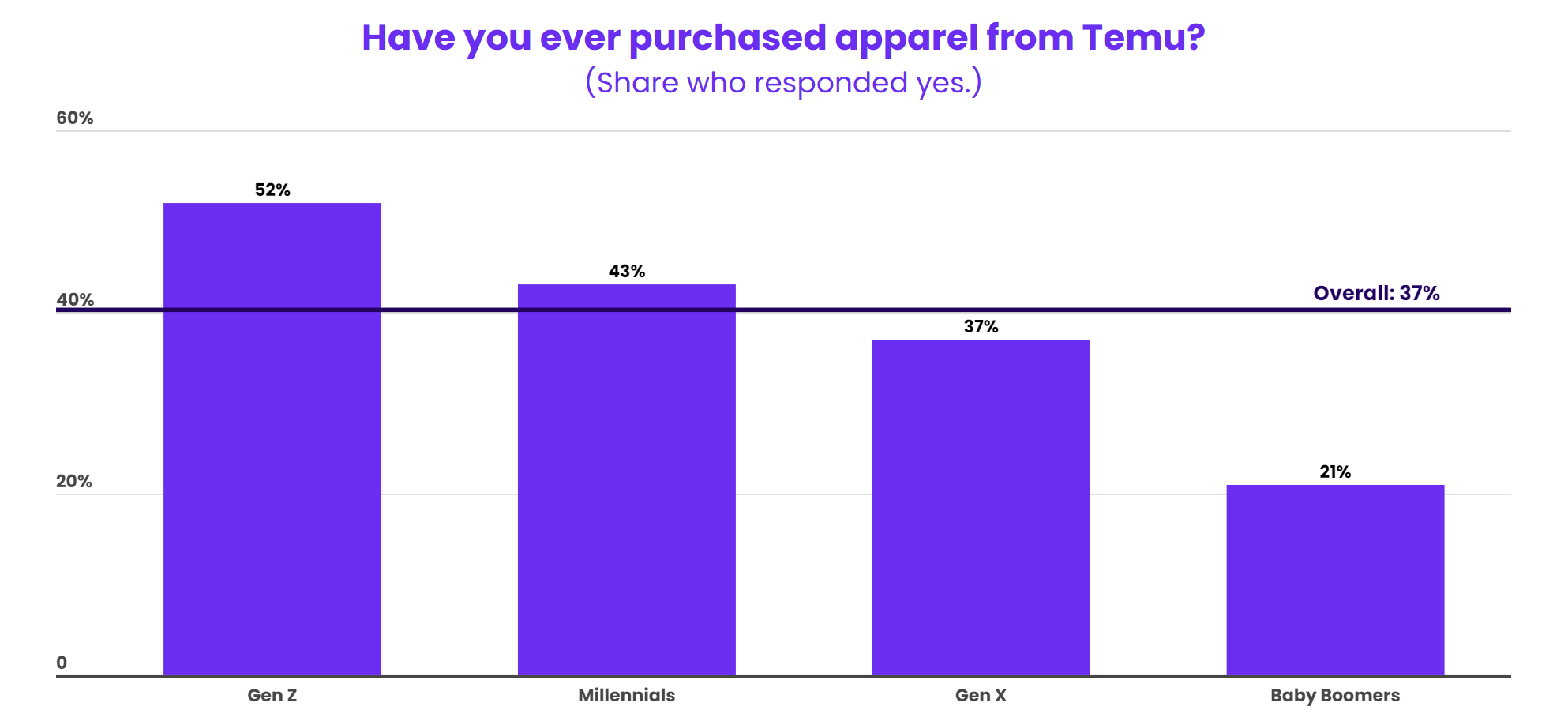 自2022年9月进军美国市场以来,Temu通过大规模且有效的广告营销在吸引美国消费者方面取得了重大进展。数据显示,近40%的美国服装消费者曾从Temu购买过服装。Z世代在此平台购买过的比例最高,达到52%,其次为千禧一代(43%)、X世代(37%)和婴儿潮一代(21%)。