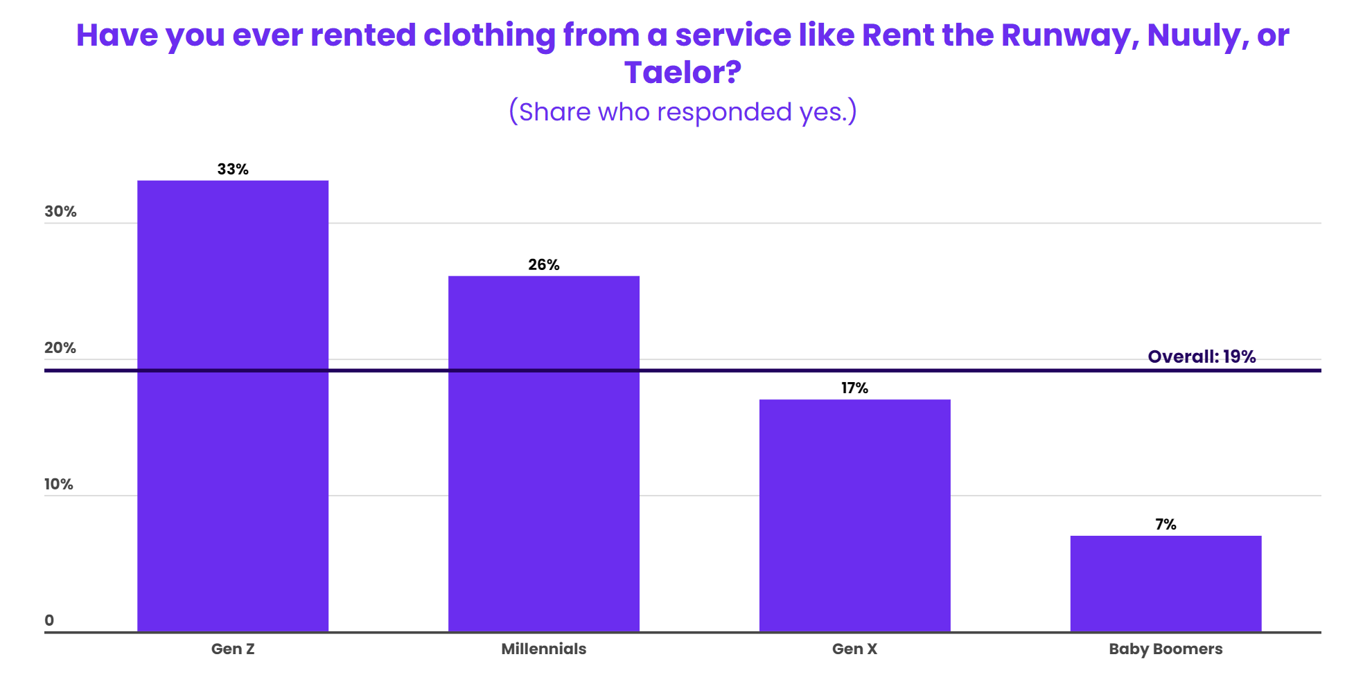 对于希望在省钱的同时享受多样选择的消费者来说,在线服装租赁服务极具吸引力。过去一年中,19%的消费者曾从Rentthe Runway、Nuuly和Taelor等平台租过衣服,其中近三分之二表示将至少维持和过去一年一样的频率。在线服装租赁在年轻一代中也更受欢迎,33%的Z世代和26%的千禧一代使用过此类服务,而婴儿潮一代只有7%。