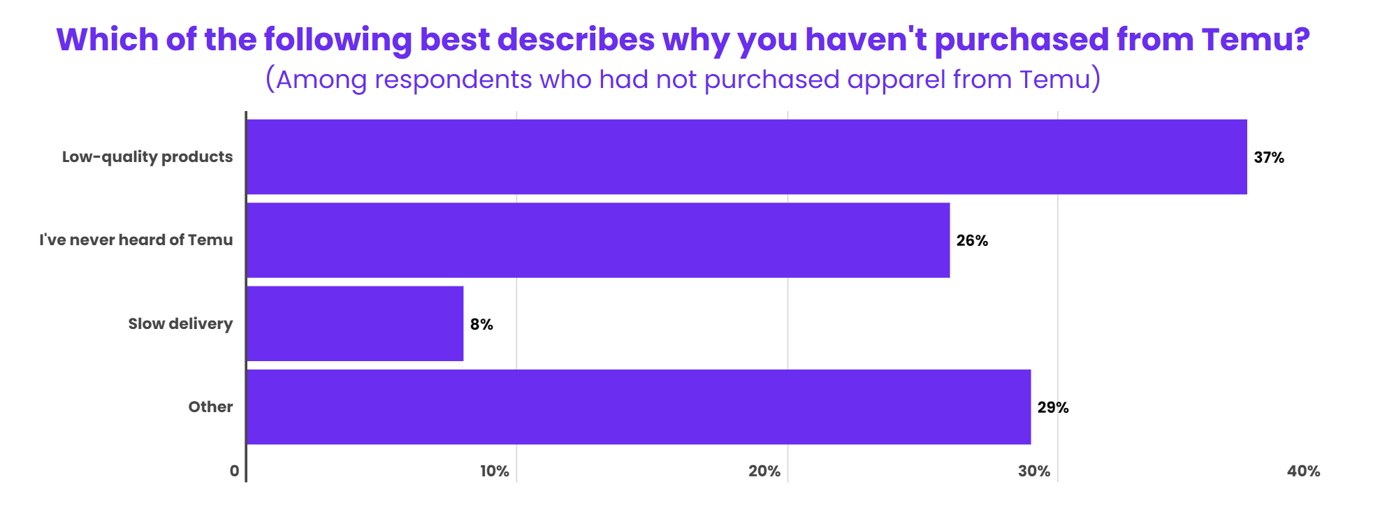 当被问及对从Temu购买的服装产品质量的感受时,72%的消费者表示满意,28%的消费者表示不满意。在表示从未从Temu购买过产品的消费者中,37%的消费者表示是担心产品质量。而尽管Temu在美国市场大力推广,仍有26%的消费者表示从未听说过它,还有8%的消费者则对配送速度表示了担忧。