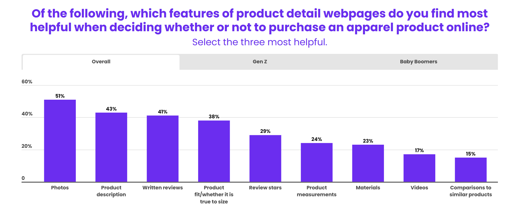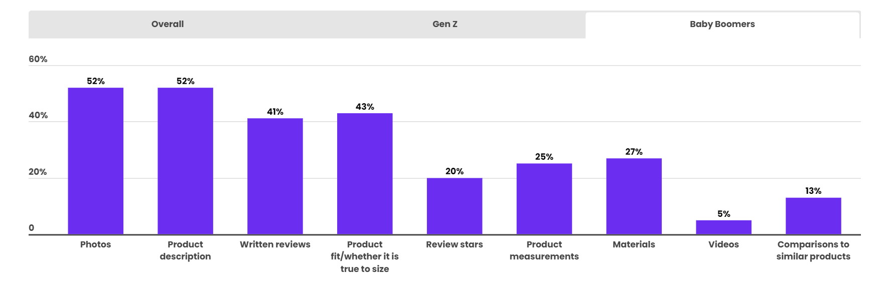 对于婴儿潮一代消费者来说,最有效的功能和整体消费者基本一致,只有5%的婴儿潮一代认为视频是最有用的三个功能之一,而28%的Z世代将视频作为首选。与此同时,52%的婴儿潮一代认为产品描述最有帮助,而在Z世代中只有30%如此认为。