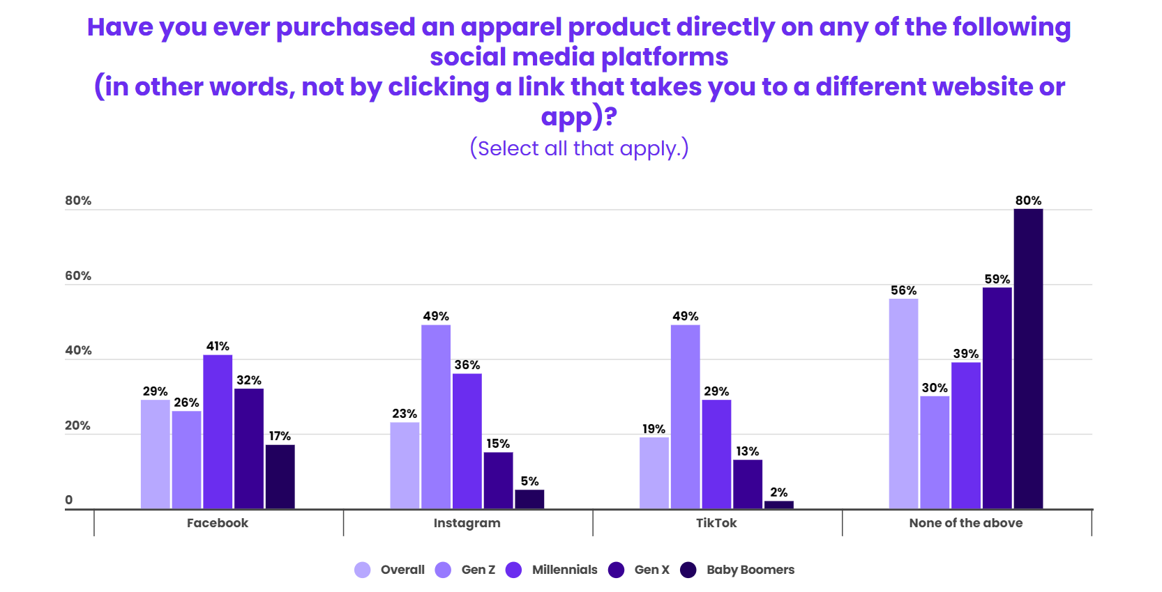即使在年轻消费群体中,Z世代和千禧一代也存在着显着差异。49%的Z世代曾在TikTok上购买过服装,而千禧一代这一比例仅为29%。相反,千禧一代更喜欢通过Facebook购买服装,比例达到41%,而Z世代中这一比例仅为26%。