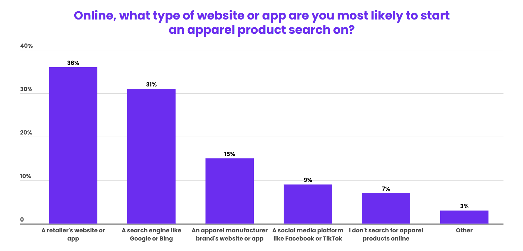 对于在线搜索服装产品的渠道,36%的消费者选择零售商网站或应用,谷歌、必应等搜索引擎以31%的比例位居第二,还有15%的消费者表示最有可能在品牌网站或应用上开始在线服装产品搜索。而除了主导产品的发现外,社媒平台也正在成为搜索的重要渠道,9%的消费者首先通过这一渠道进行搜索。