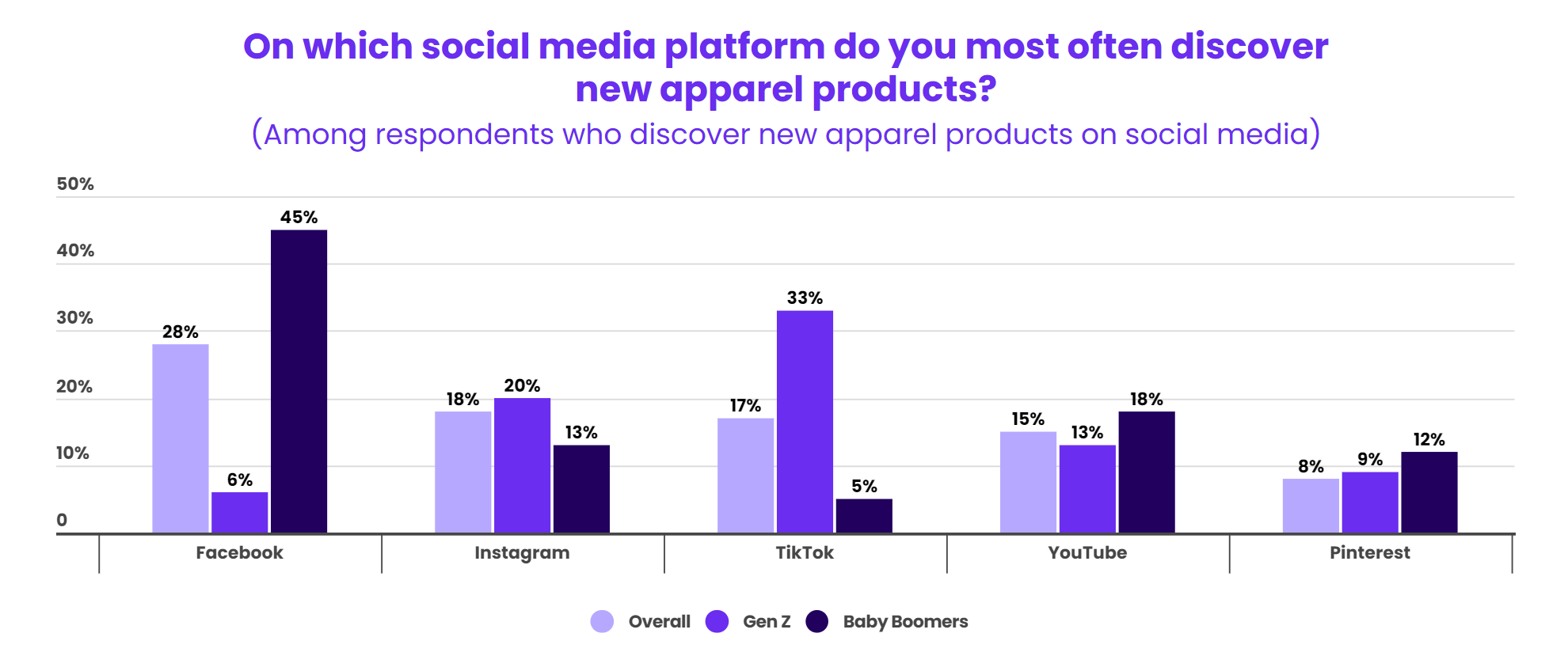 许多消费者认为社媒平台是最常能发现新产品并随后购买的渠道,占比39%。其次为店内展示或招牌(29%)、搜索引擎(27%)和在线平台(20%)。其中Facebook占据首位,占比28%,其次是Instagram(18%)和TikTok(17%)。不同代际的消费者常用的平台也存在差异,45%的婴儿潮一代偏好Facebook,而只有6%的Z世代选择该平台。相反,Z世代更喜欢通过TikTok发现服装产品,比例达到33%。