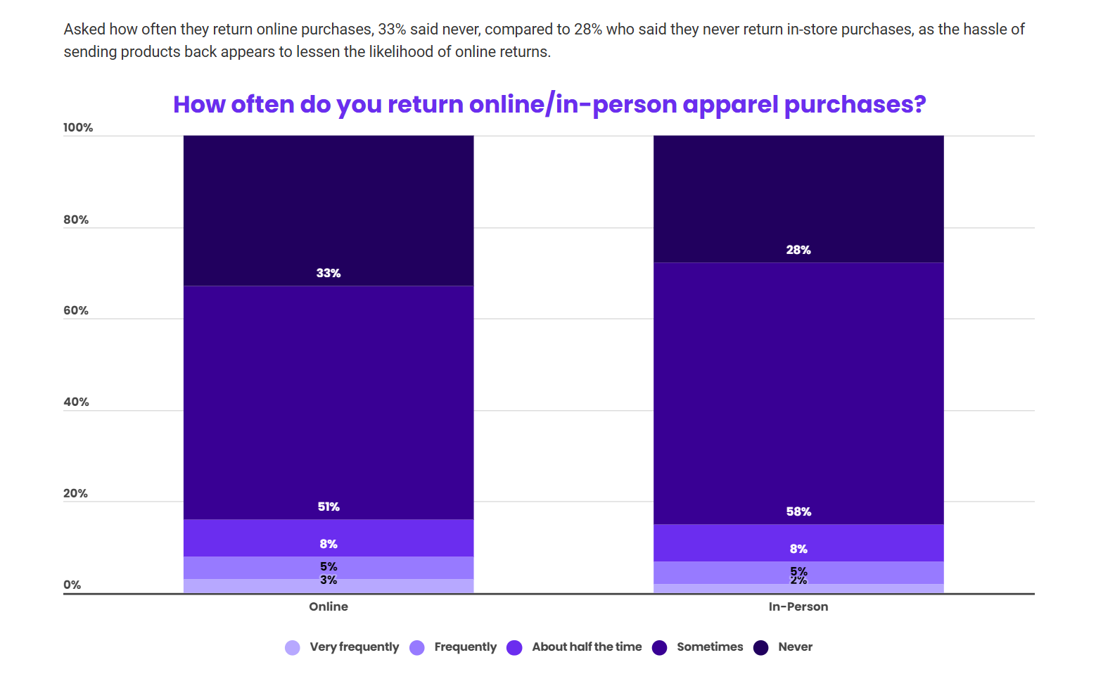 调查显示,33%的消费者从不会退回网购的服装,而28%的消费者表示从不退回实体店购买的服装。在退货频率方面,退货流程的繁琐程度一定程度上降低了网购退货的可能性。