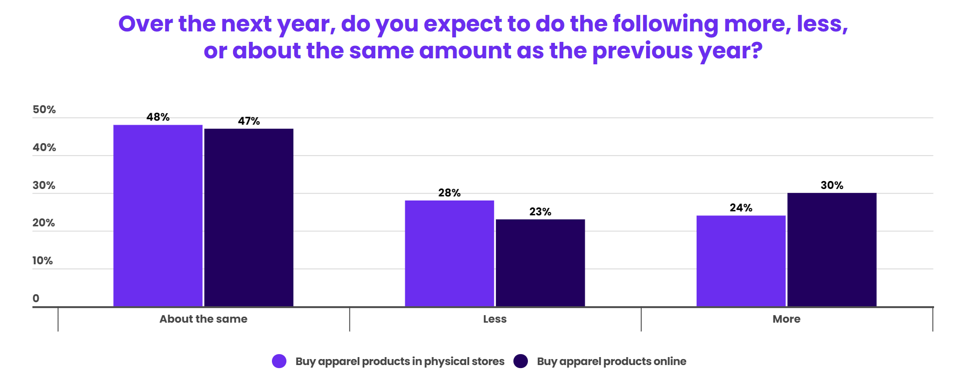 当被问及未来一年服装购买量将如何变化时,30%的消费者预计会在网上购买更多服装,而24%的消费者预计会在实体店购买更多。近一半的消费者表示线上和线下的服装购买量将保持不变。此外,预计未来一年增加服装网购量的人数高于预计减少购买的人数,而对于在实体店购买的消费者则相反。