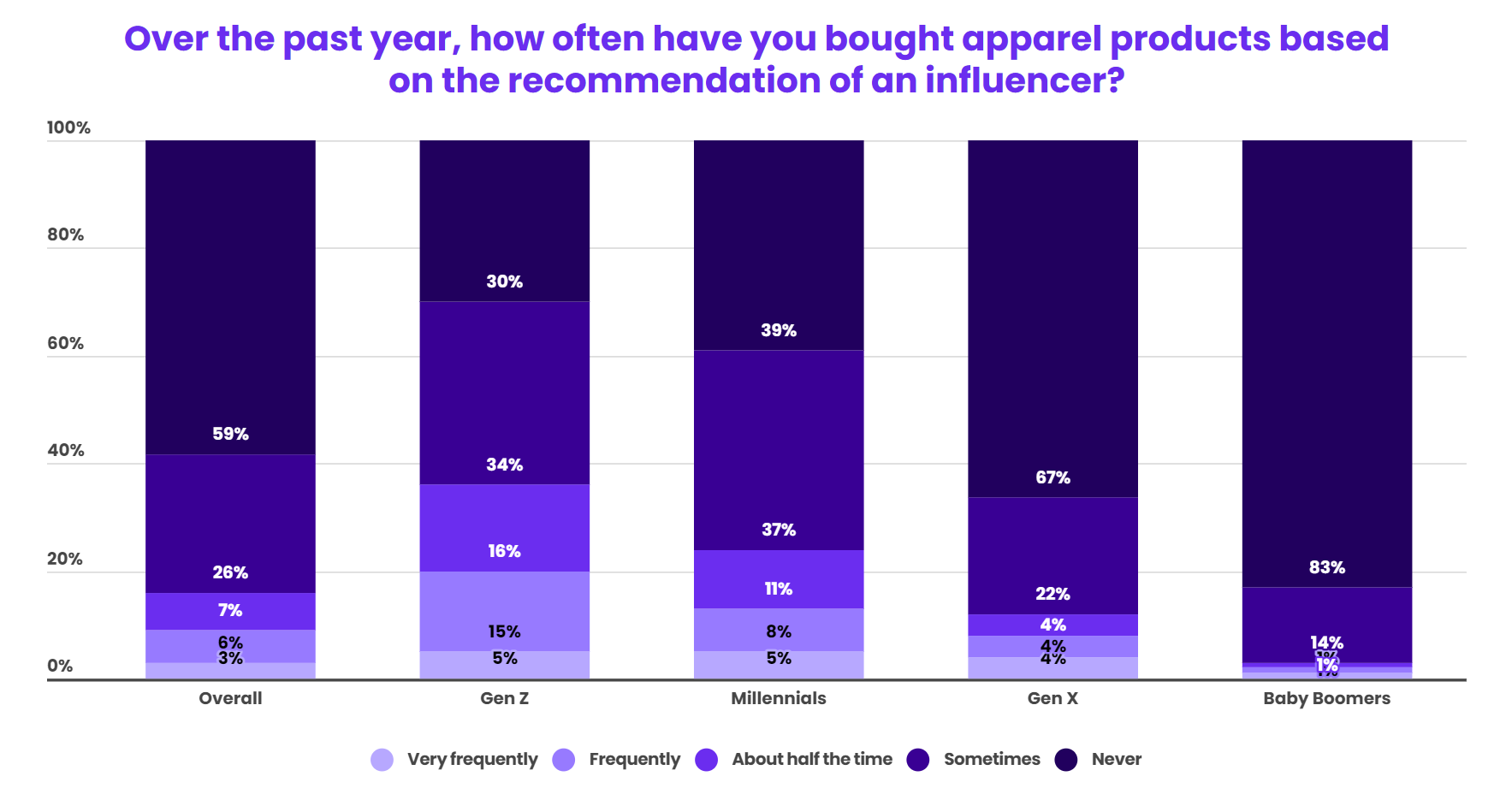 随着社媒平台的兴起,网红已成为许多消费者信赖的产品推荐来源。过去一年中,超过40%的消费者曾根据网红的推荐购买了服装,在Z世代中这一比例跃升至70%,而婴儿潮一代中的比例仅为17%。事实上,36%的Z世代表示,他们大约一半或更多的服装购买都基于网红推荐。